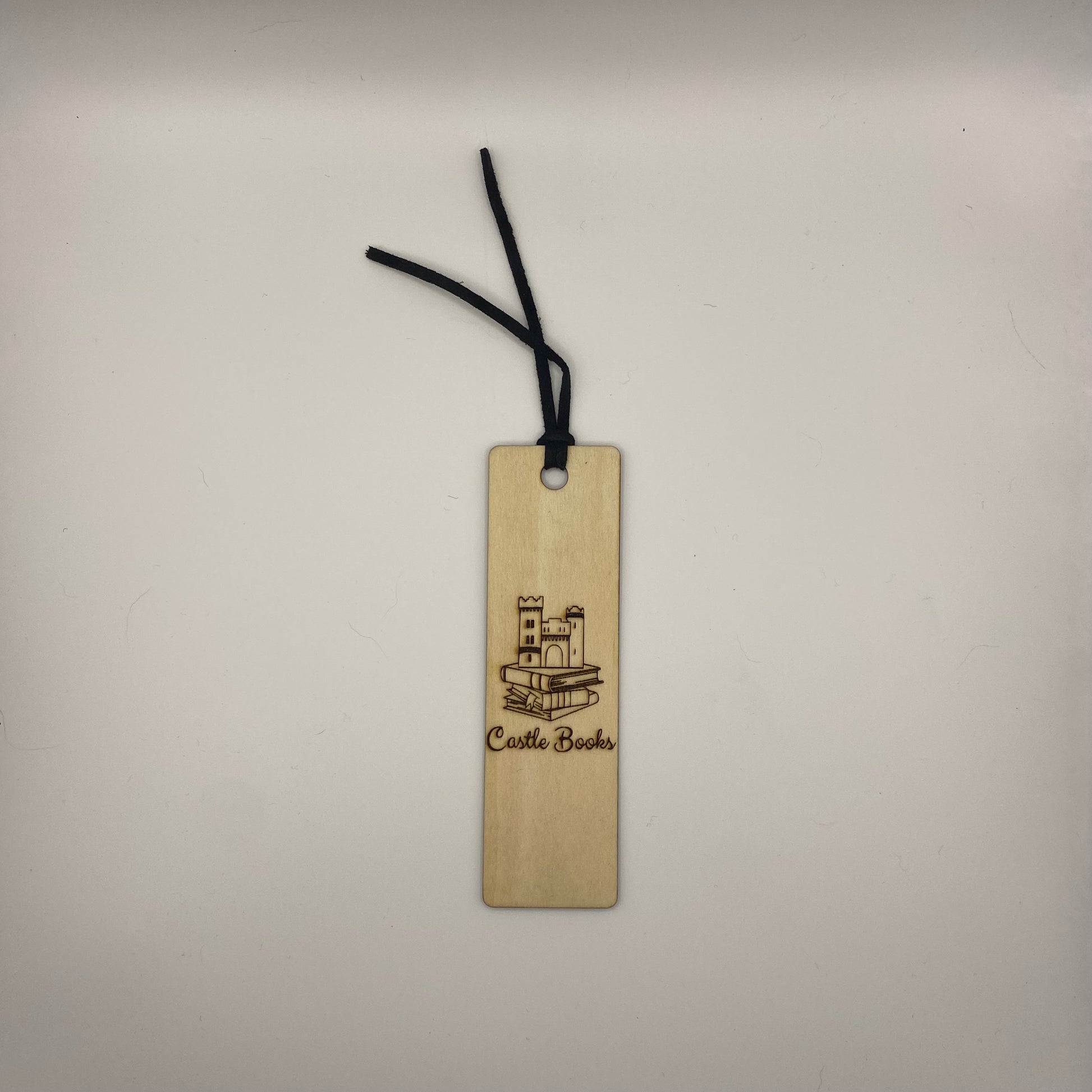 Thin wooden bookmark with the logo of Castle Books laser engraved on the front. Faux leather cord. Great for supporting this small business and having a cool bookmark. Not too thick, either.
