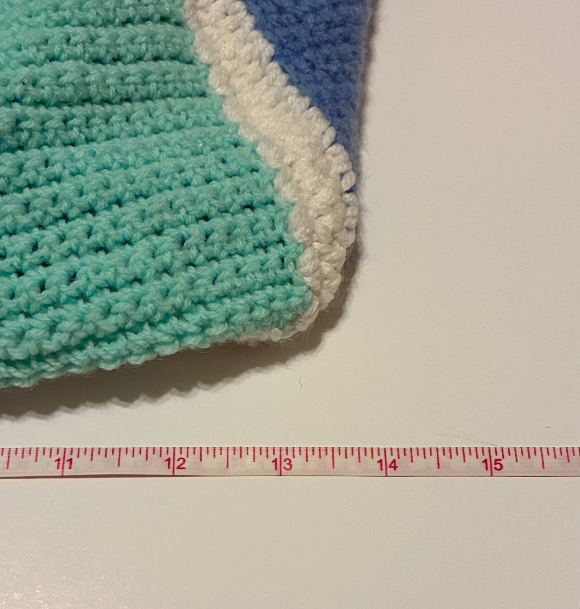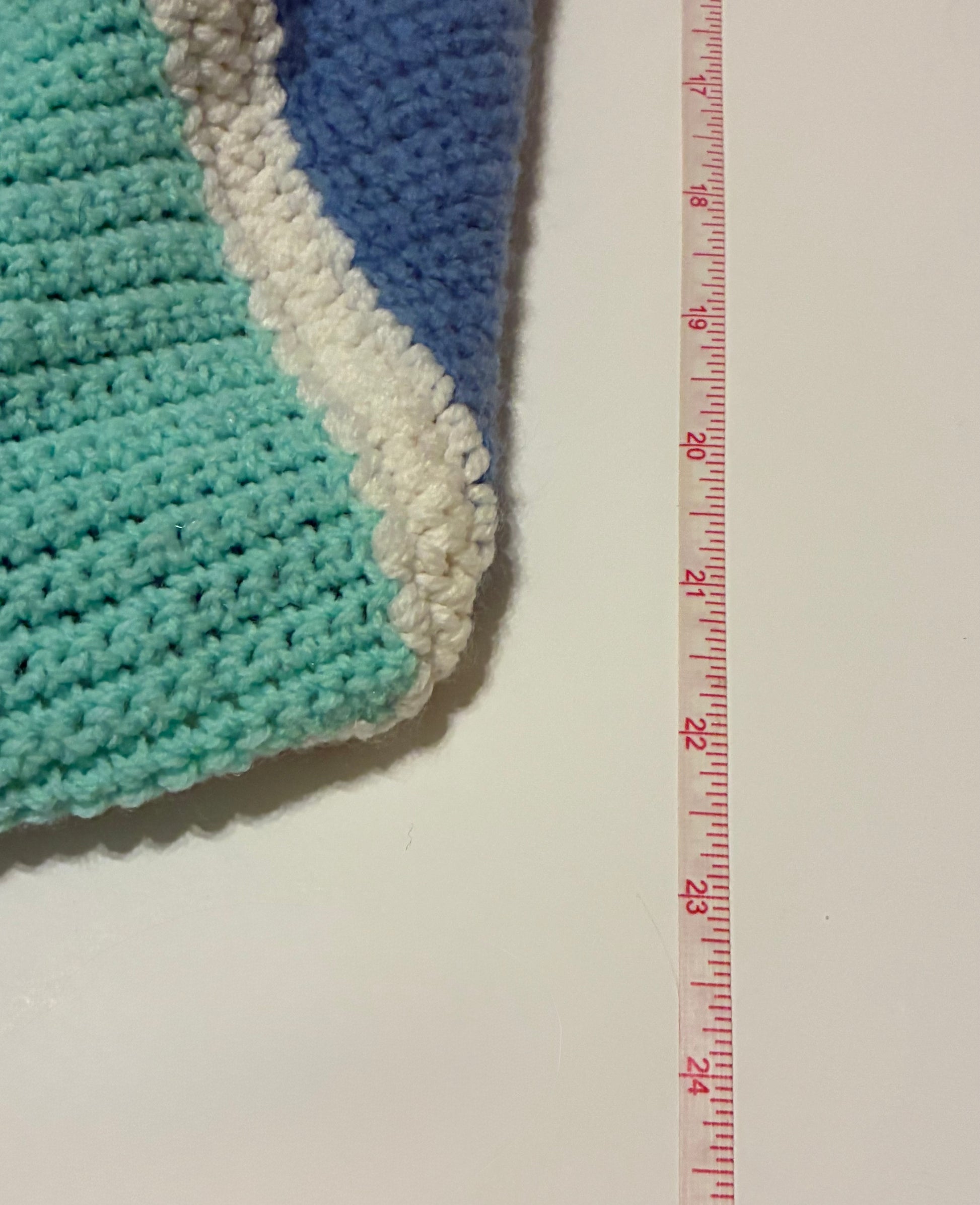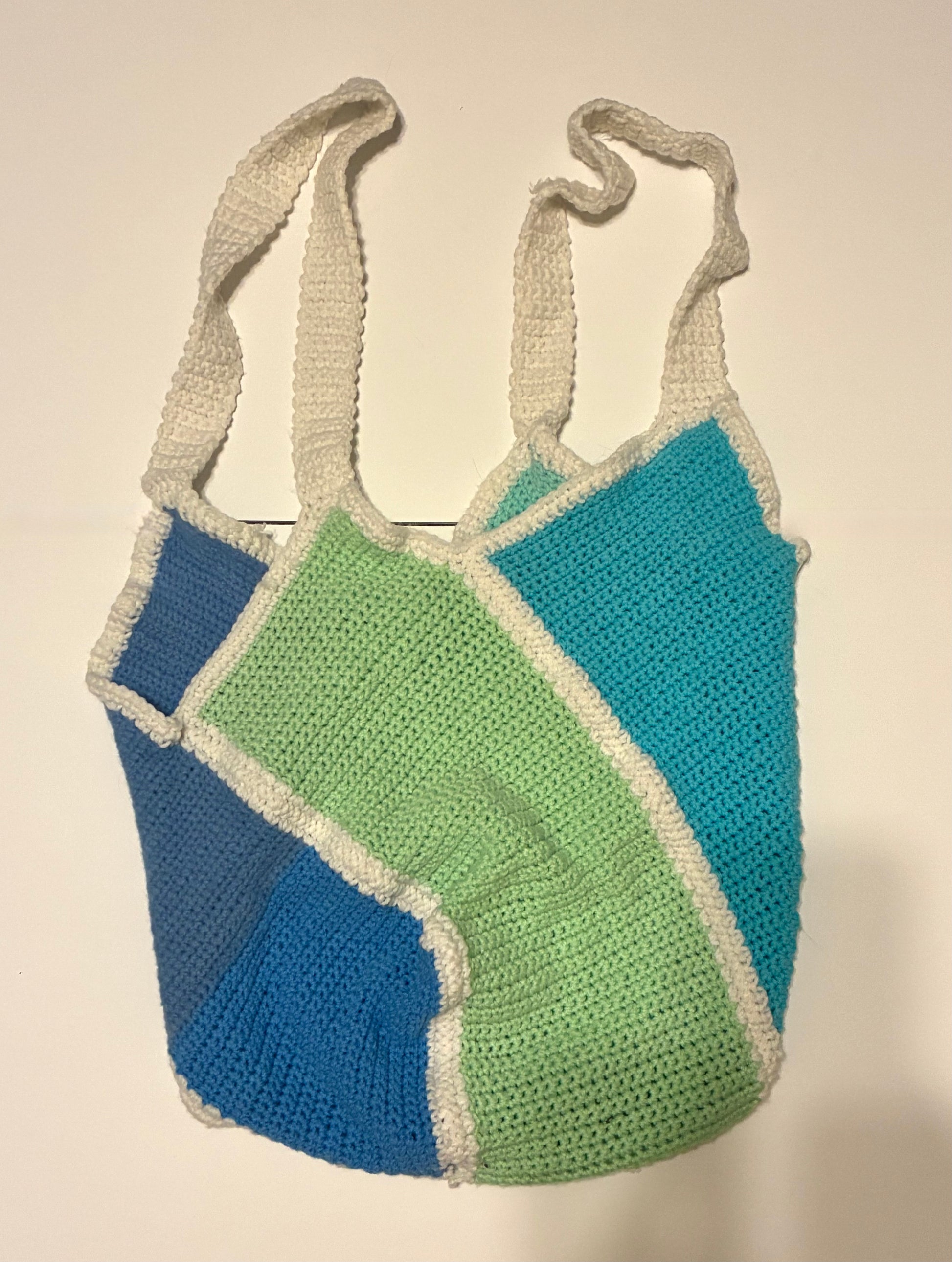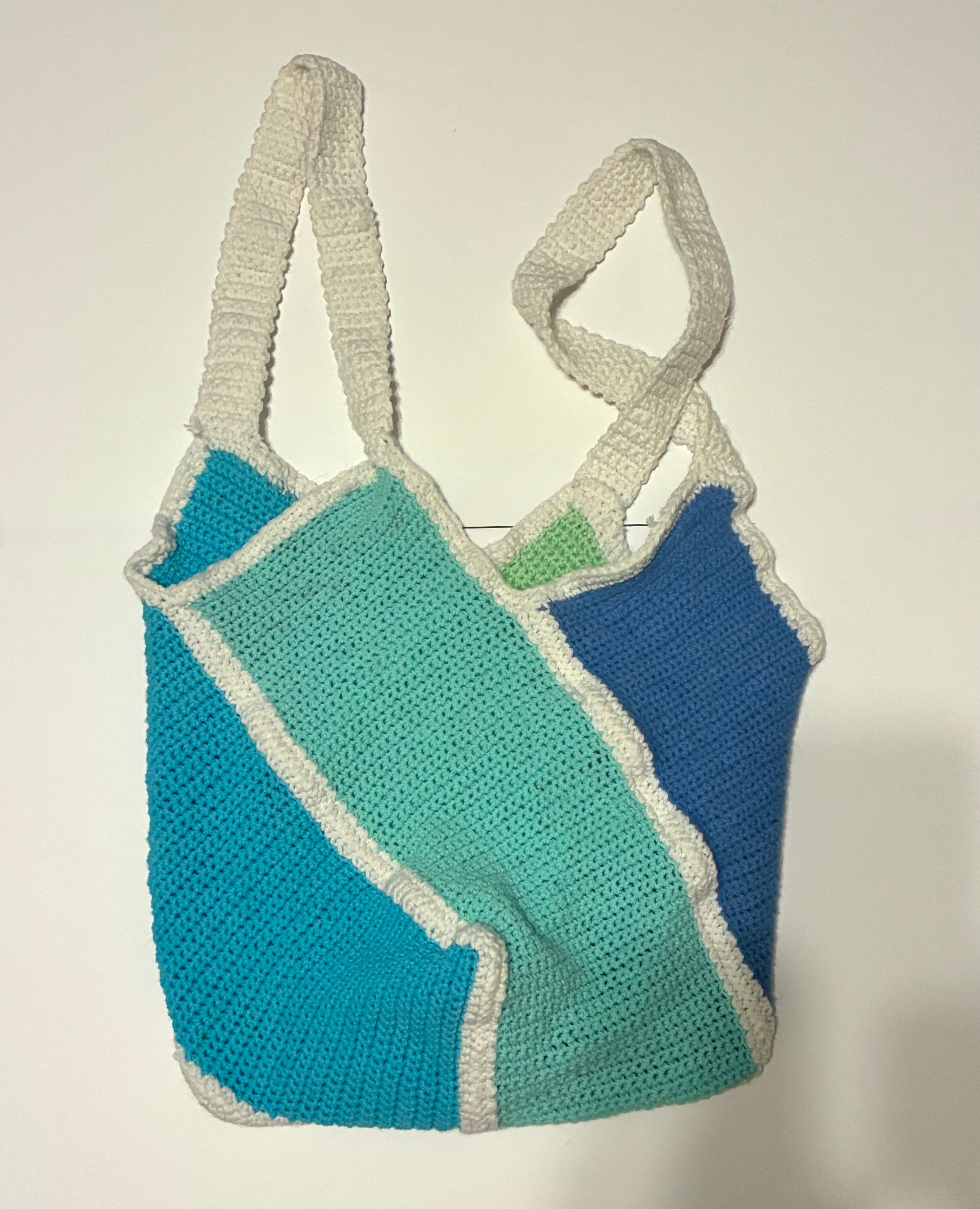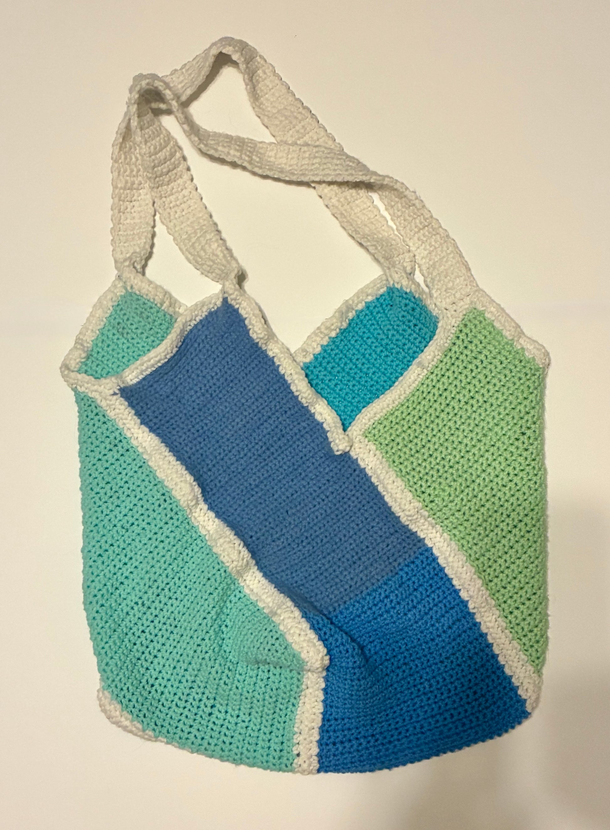 Made of four strips crocheted together and straps added. Great for a beach day or going to the farmer's market. Blue, green, seafoam, and aqua.