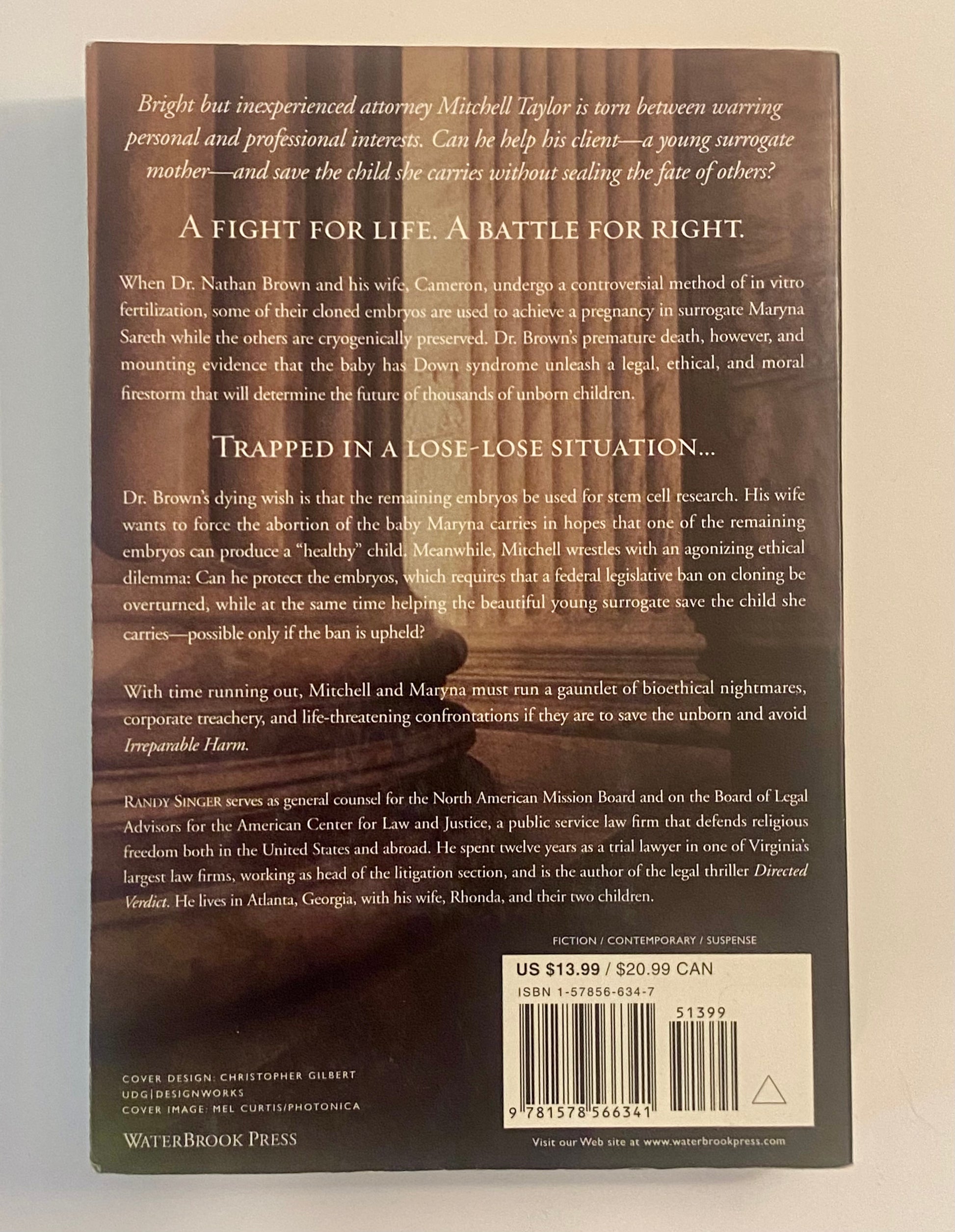 Bright but inexperienced attorney Mitchell Taylor is torn between warring personal and professional interests. Can he help his client, a young surrogate mother, and save the child she carries without sealing the fate of others? The compelling answer lies in Randy Singer's new legal thriller Irreparable Harm.