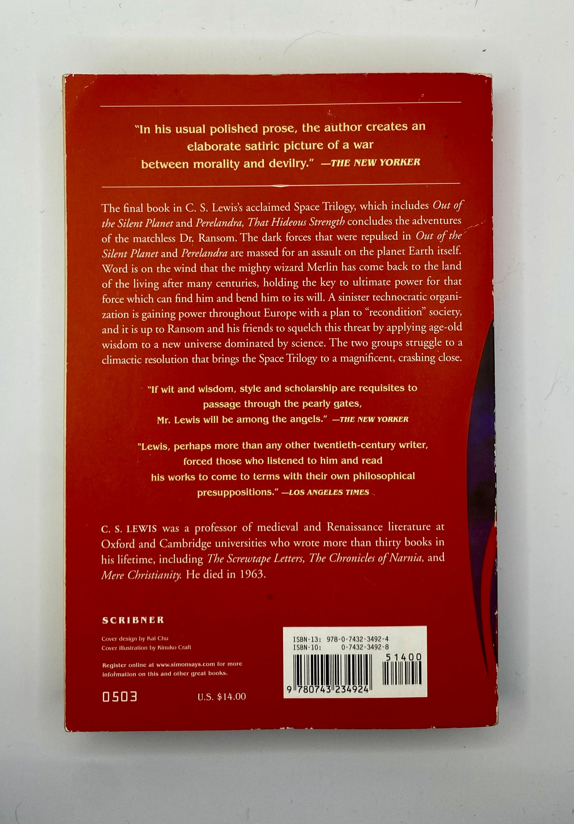 This is the third novel in C.S. Lewis's science-fiction trilogy. The final story is set on Earth and tells of a terrifying conspiracy against humanity.