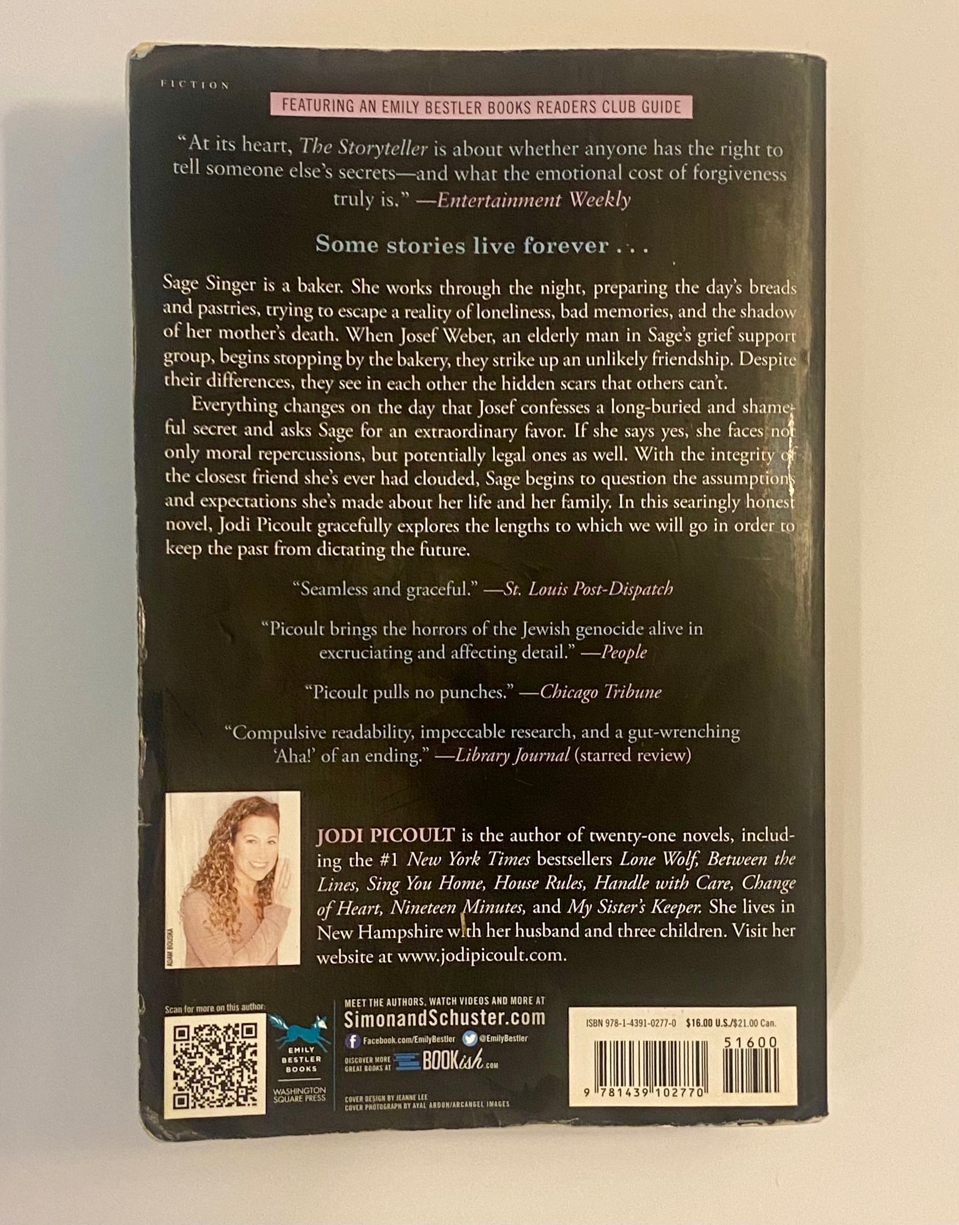 Sage Singer is a baker. She works through the night, preparing the day’s breads and pastries, trying to escape a reality of loneliness, bad memories, and the shadow of her mother’s death. When Josef Weber, an elderly man in Sage’s grief support group, begins stopping by the bakery, they strike up an unlikely friendship. Despite their differences, they see in each other the hidden scars that others can’t, and they become companions.